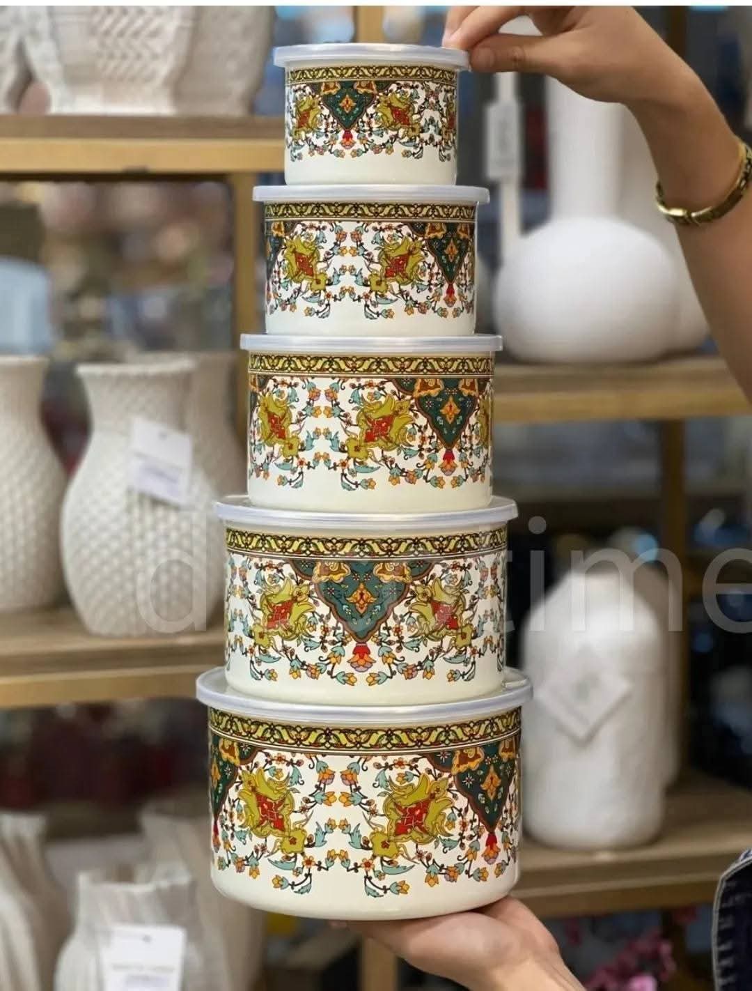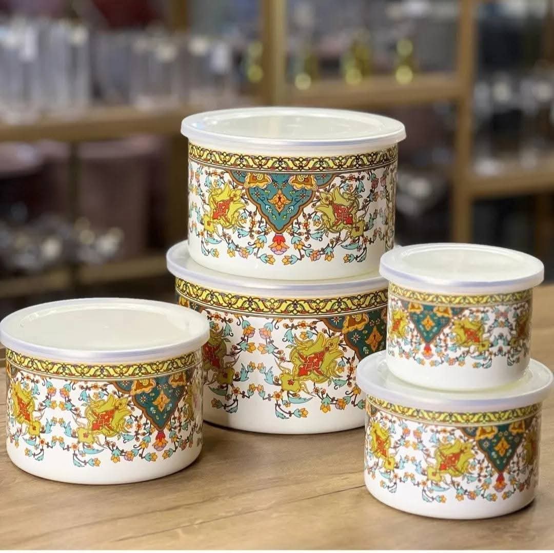 This 5-piece enamel bowl set is a beautiful and functional addition to any kitchen. Each bowl includes a matching lid, making it perfect for mixing, serving, and storing a variety of foods. The classic enamel finish offers durability and vintage charm, while the range of sizes makes this set incredibly versatile.