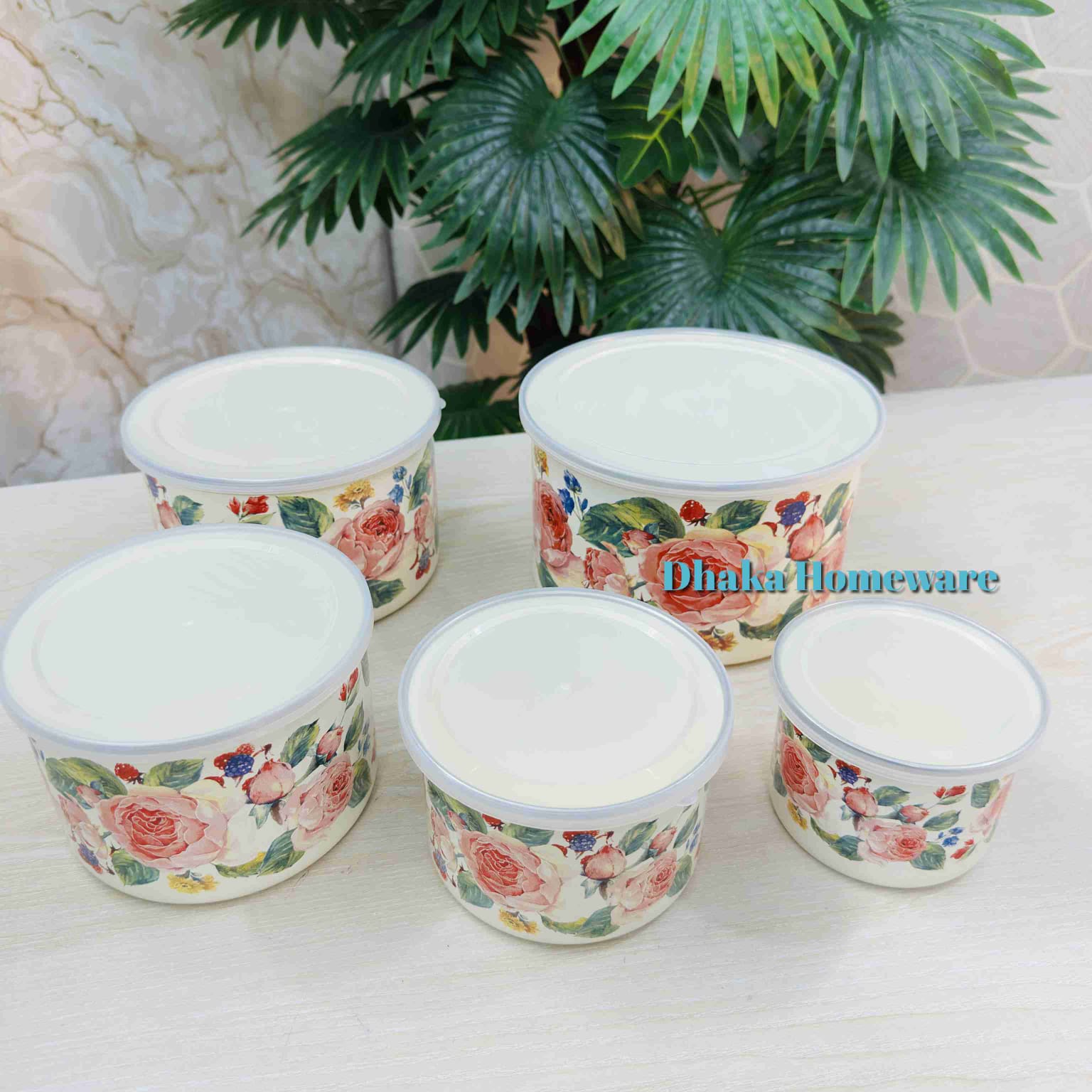 This 5-piece enamel bowl set is a beautiful and functional addition to any kitchen. Each bowl includes a matching lid, making it perfect for mixing, serving, and storing a variety of foods. The classic enamel finish offers durability and vintage charm, while the range of sizes makes this set incredibly versatile.